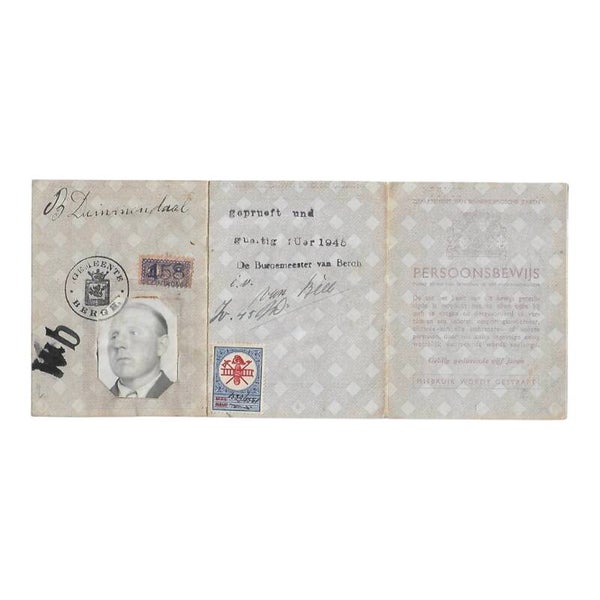 Really nice set van 3 familieleden. Moeder, vader en zoon ze zijn alle 3 uitgegeven in Bergh (gld). De zoon heeft meegewerkt aan de bouw van de atlantikwall getuige de W.B. stempel op de voorzijde. Ook was hij lid van de gemeentelijke- of bosbrandweer getuige de blauwe brandweer zegel. Een zeer leuke set die perfect zou staan in een display!!