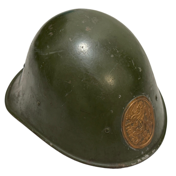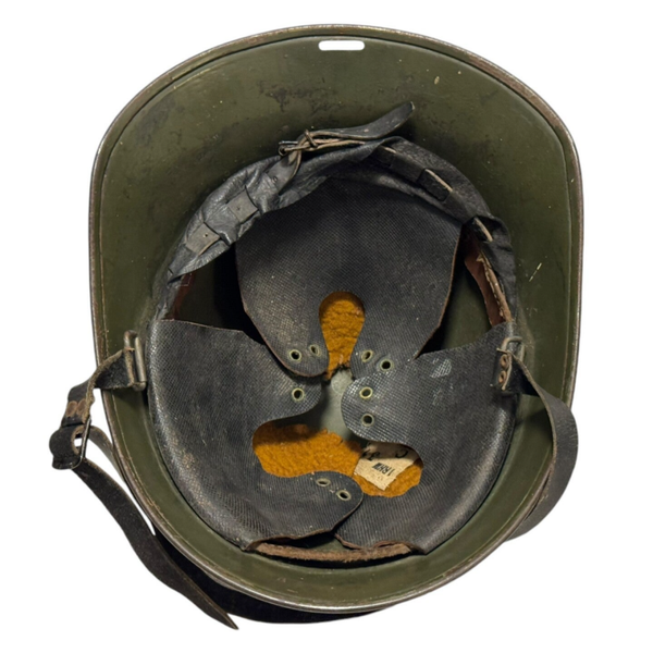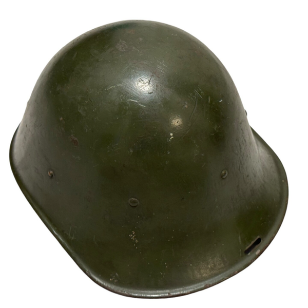 Nederlandse army helm, helaas is de helmplaat opgepoetst dit gebeurde vaker al was dit zeer gevaarlijk. Hierdoor was her namelijk makkelijker voor de duitsers om te richten. De helm is gemaakt door de volharding te amsterdam. Ook is hij CM1938 gestempeld. In het binnewerk zit een stukje vilt met 1 RHM dat betekend '1ste regiment huzaren motorrijder'. Al met al een leuke helm voor iedere collectie!!
