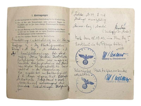 De documenten verkeren nog in een leuke staat. Helaas zijn ze niet meer in geweldige staat. Alle documenten horen bij dezelde mevrouw ''Emma Wloka'. Aan de documenten te zien is ze onder andere in het oostfront geweest. Het boekje bevat vele duitse stempels. Zeer leuke set om verder uit te zoeken!