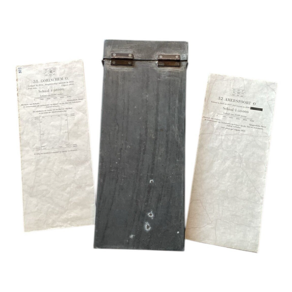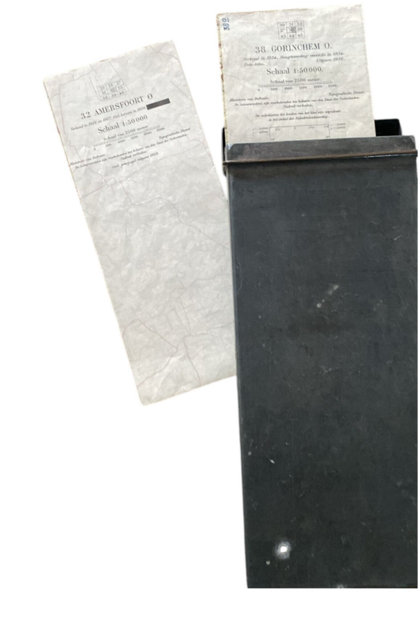 Tin for Dutch staff maps, it is still in excellent condition and comes with 2 maps from Amersfoort and Gorinchem. Both in good condition. This version is smaller than the well-known large tin. Nice for in the display case!