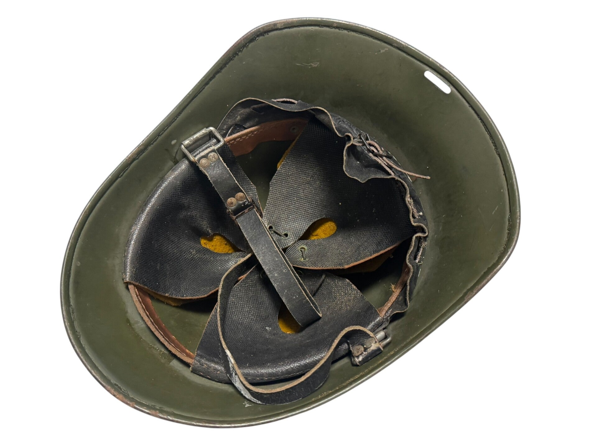 The helmet is still in neat used condition and may have been lightly repainted at some point. Still a great Dutch helmet, stamped on the inside with CM1937. The chinstrap is also still at full length. The helmet would look very nice on a mannequin!