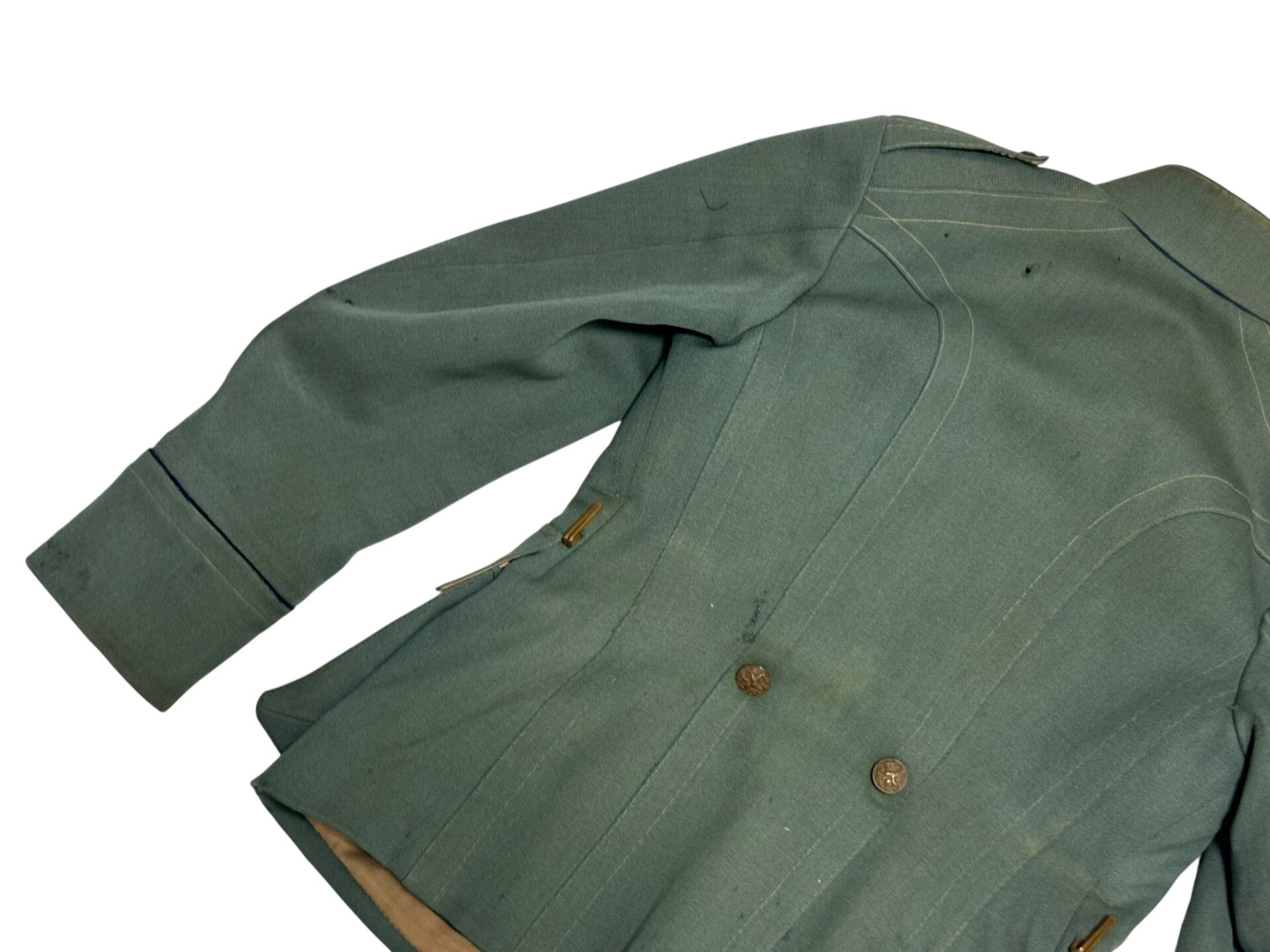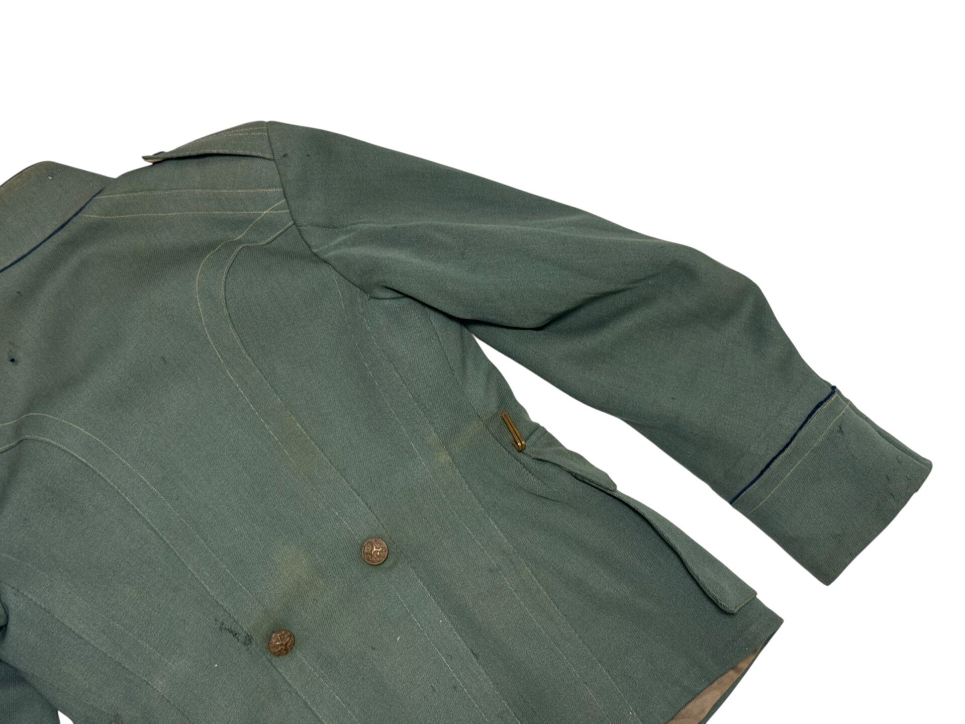 Het jasje verkeerd nog in een nette staat en komt samen met de bijbehorende baton. Ook staat hij op naam van Ko Poelstra en is hij gemaakt in kampen. Helaas zit de binnenstof van de kraag deels los. Alsnog een zeer gaaf jasje die mooi op de pop zou staan!