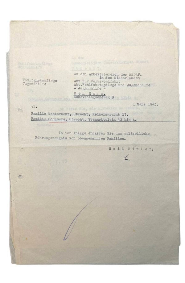 This dossier consists of correspondence and reports regarding the Schreurs family, residing at Veemarktplein 42 bis A in Utrecht, during 1943. It includes information from the Municipal Medical and Health Service Utrecht, the Utrecht police, and the NSDAP Amt für Volkswohlfahrt in occupied Netherlands.