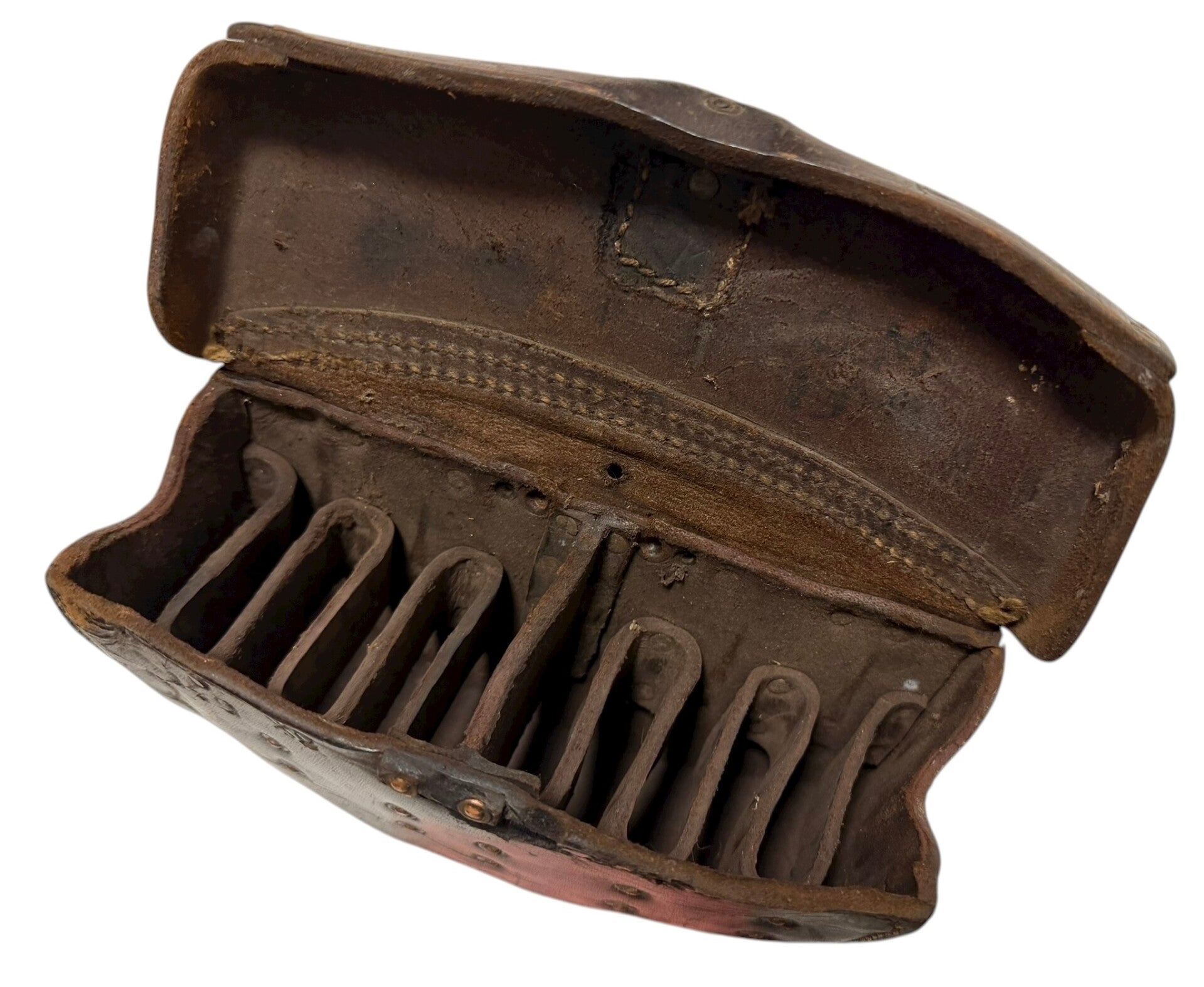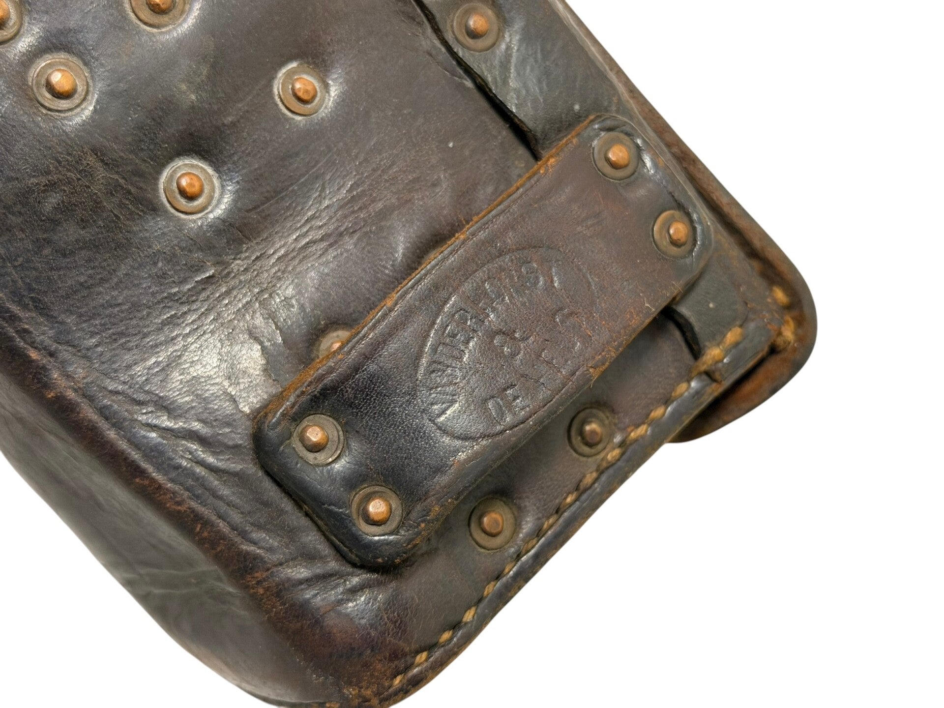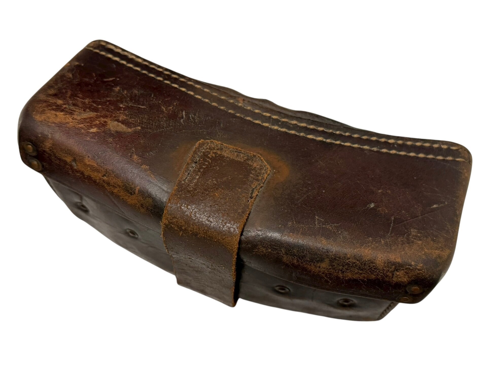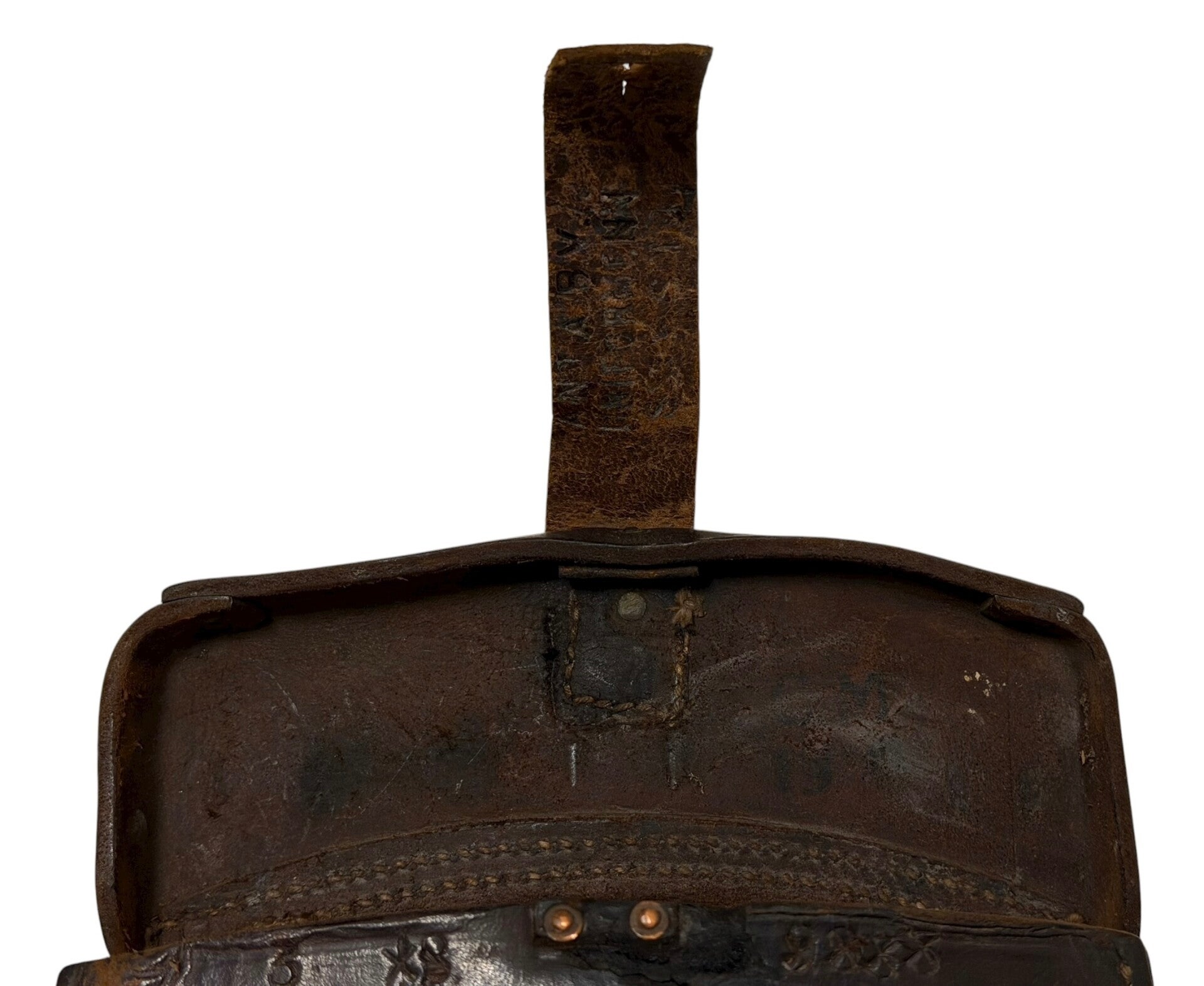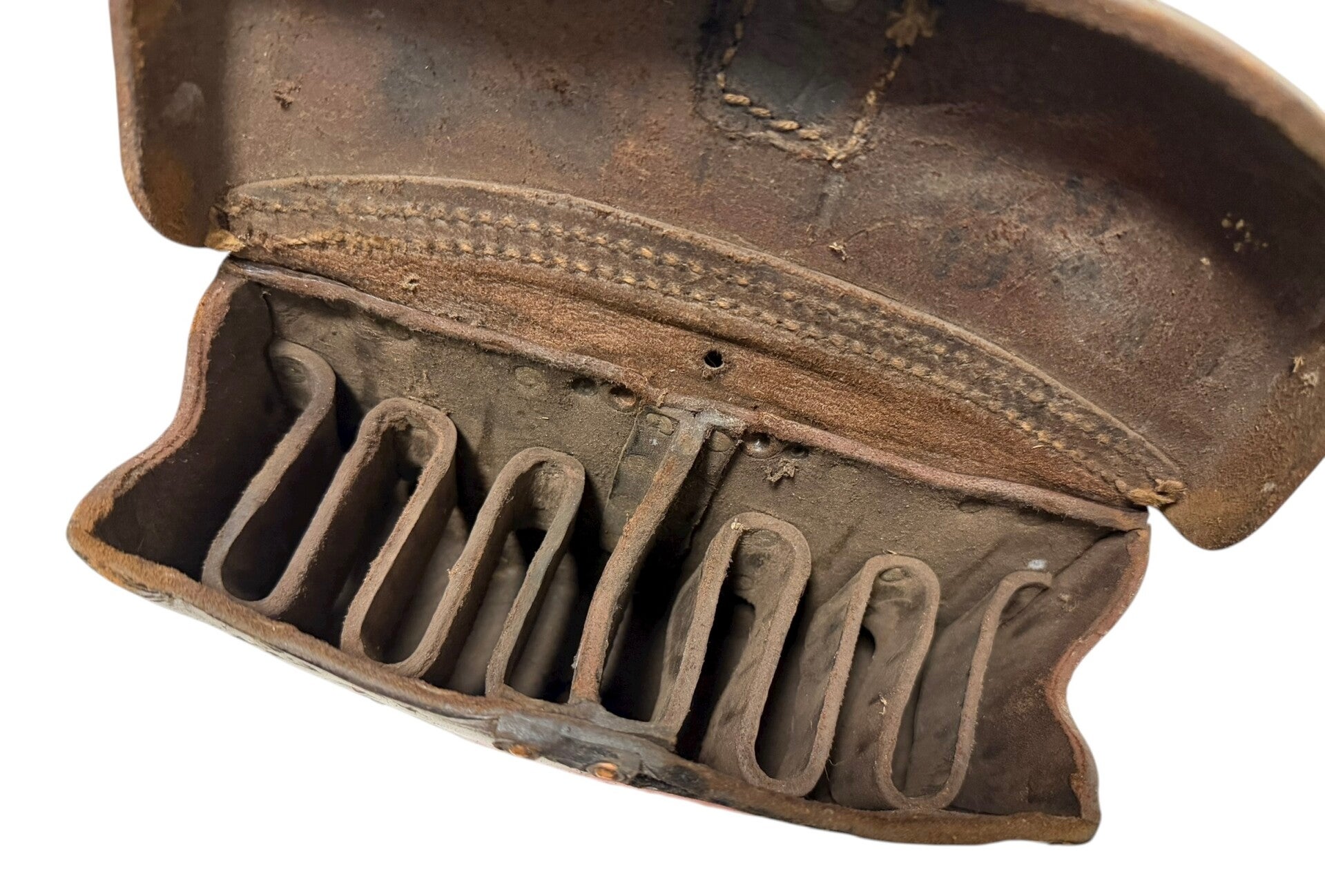 The pouch is in heavily used condition and is missing the hook on the back. This is a right-side pouch, as the compartment for the weapon key is missing. However, it is CM1916 stamped. Nice piece for display in a showcase or on a mannequin.