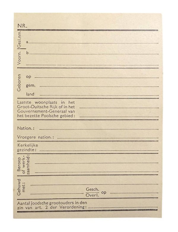 Uniek documenten die was verplicht door de leider van nederland tijdens de duitse bezetting (Arthur seyss inquart). Ieder joods persoon moest een bewijs van aanmelding kaart kopen voor 1 gulden. Als ze dit weigerden riskeerden ze een gevangenisstraf van 5 jaar.