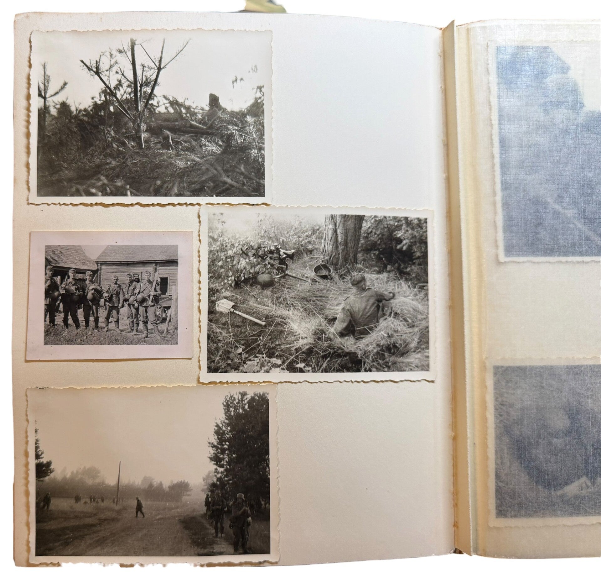 The photo album contains 138 period photos. Nice to see the progression of a normal family into a family in wartime. The boy starts as a normal soldier, after which he becomes an officer over the course of the war. There is also a colored photo included. On the back some cards have been added, including notes. Very interesting for the collector, the book certainly deserves further research!