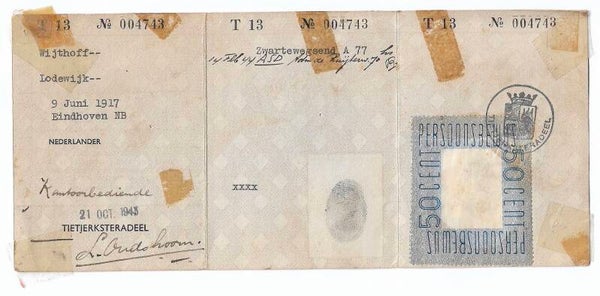Interesting 'Persoonsbewijs', this one was recently found with a whole lot of blank ID cards. Possibly therefore used for resistance purposes. The 50 cent stamp is only glued at the top, so that the stamp mark remained intact. The tape on the ID is quite unfortunate. Still a very interesting ID for in the collection!